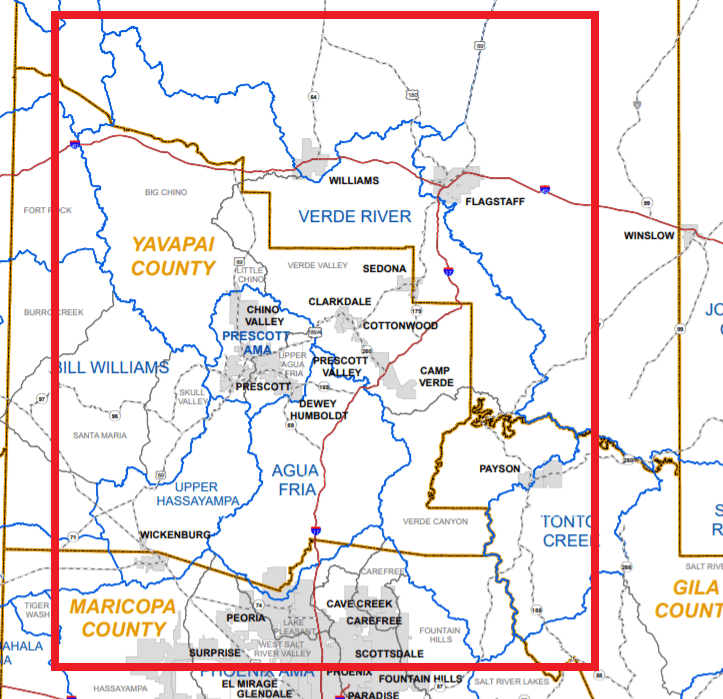 This basin sweep covers an area generally in the central – northwestern portion of the state and extends west of Payson and Flagstaff, east and southeast of Peach Springs and north of Bradshaw and Mazatzal Mountains. The Phoenix AMA consists of the Little Chino and Upper Agua Fria Sub-basins and the Verde River Basin consists of the Big Chino, Verde Valley and Verde Canyon Sub-basins.